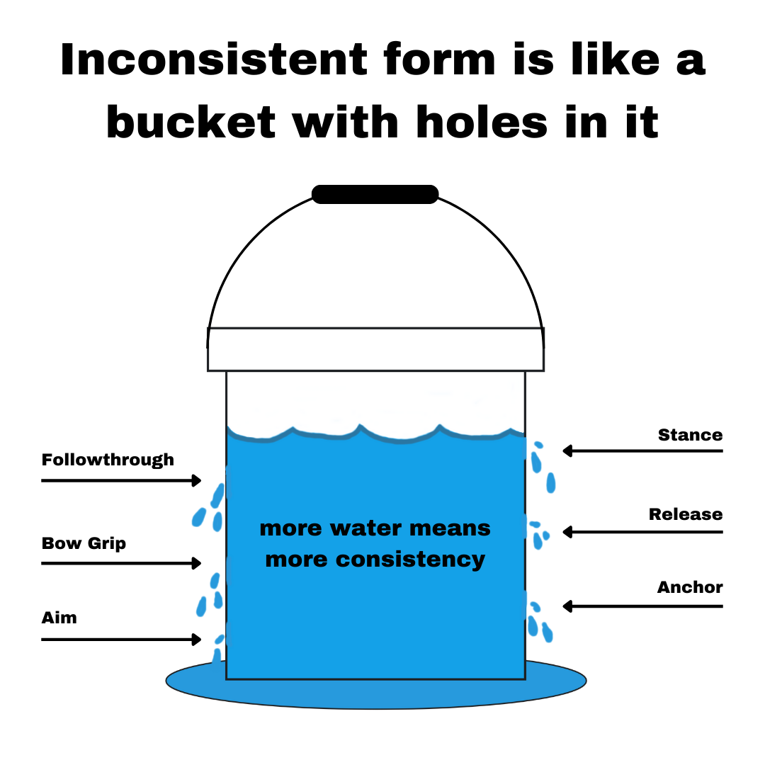 There are many different components that go into executing the perfect shot. Some pieces are more important than others. By paying more attention to the things that have the biggest impact on your shot, you increase your odds of success. In this analogy, we compare these different parts of form to holes in a bucket. Lower holes will let more water out, thus having a greater impact on your shot. It is important to patch up these holes through the repetition of perfect execution in both practice and competition.